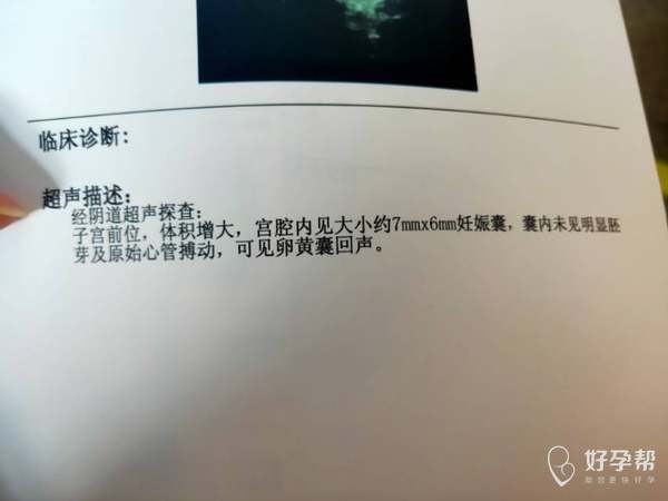 是正常的,现在是宫内孕,可以2周后复查彩超,那时有胎心胎芽就是正常的。增强营养,多吃蔬菜水果肉蛋奶及坚果类食品