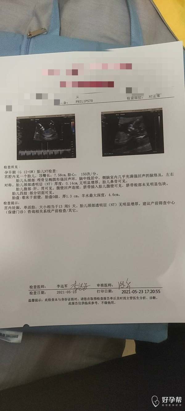 做了三次NT的结果,第一二次医生都说位置不好,看不到,叫出去走半小时再做,第三次终于过了,结果显示没什么问题,医生下班了,还没找医生看,麻烦帮忙看一下