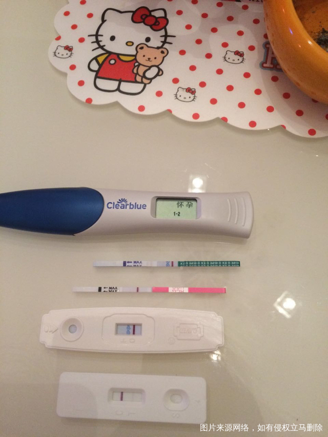 然后一直到六月15号,剩下三个排卵纸和两个早早孕,玩了一个早早孕,奶奶的还是白板。烦死我了。然后突然发现,楼楼姨妈推迟两天咯。好吧。一向准时到爆的姨妈没来。我有点窃喜。然后六月16号下午,我闲着没事吃了饭后把最后一个早早孕试纸用了。结果吃完了饭,我居然看见了灰印。哎呀那个精神头就来了。然后各种照了发给朋友看,有些人说有有些人说没有,楼楼急性子按捺不住立马跑药店买可丽蓝。然后六月16号晚上一测。艾玛。显示怀孕1-2周,加号明显。我都高兴到崩溃。瞬间不知道说啥好。第一次见双杠的心情真是无法言语。。。然后补充补充一点,六月10号左右开始楼楼的小腹就觉得疼疼的,奶头也疼疼的。腰酸。查百度原来是有了宝宝子宫变大拉到了韧带才觉得肚子疼。后面宝宝真的来了。简直高兴疯。