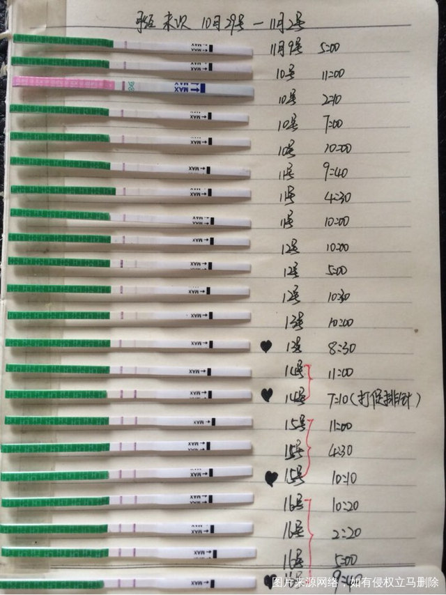 的颜色趋势,弱弱阳——弱阳——阳——强阳——弱阳——弱弱阳(或许最后还有一次强阳,那就是好孕了,如果没有,你就再次迎接姨妈迎接再次的备孕)