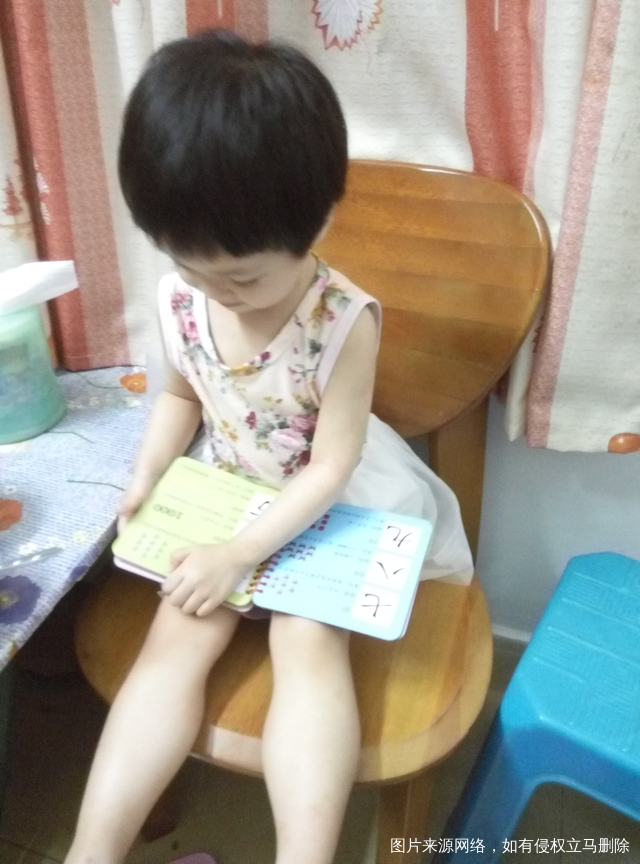 大宝喜欢拿着书本讲"故事"。这身上穿的是她最喜欢的蝴蝶结裙子