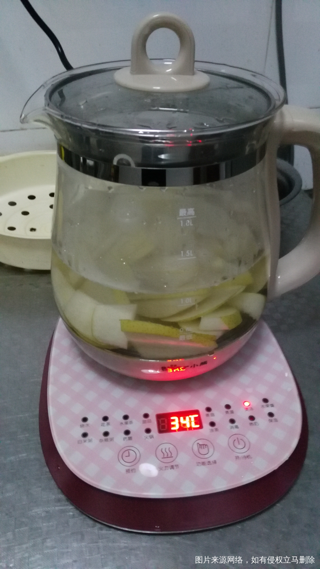 进入秋季了, 宝宝偶尔咳嗽几声。没有发烧和感冒,流鼻涕就是咳嗽。听说冰糖雪梨水有止咳化痰,润肺清燥的功效,我就买来了材料回家给宝宝熬了一锅。我用的是“好孕帮”礼品兑换的养生壶。