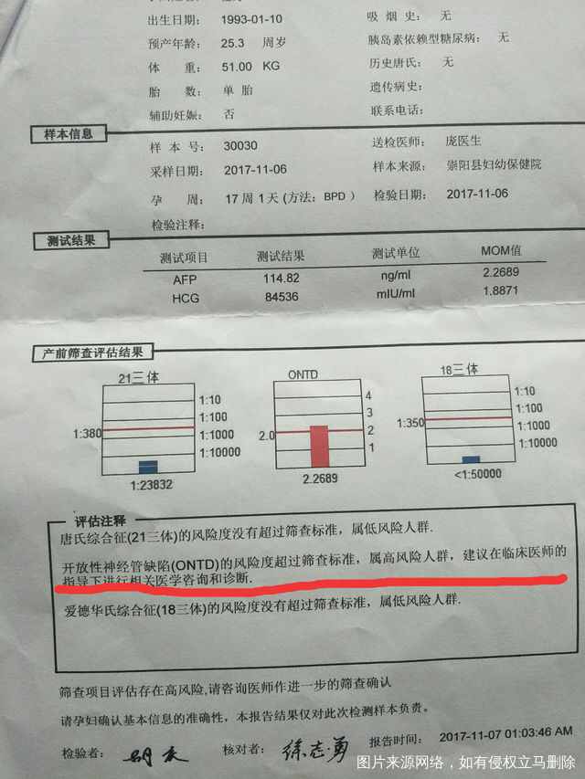 唐筛结果单,开放性神经管缺陷(ONTD)的风险度超过筛查标准。请问医生有没有问题?