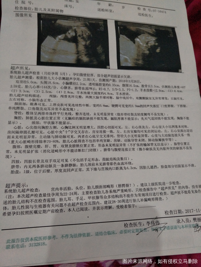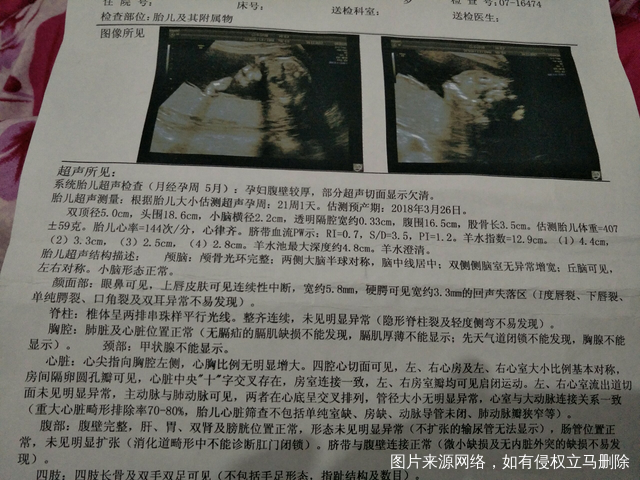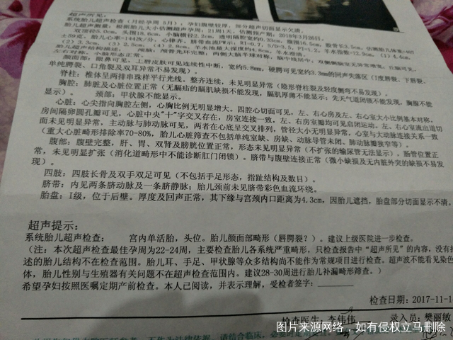 五个月了你都会整天翻身乱踢了,大宝是女孩,这胎是男孩,我整天想以后女儿双全多好啊,好几个人都劝我引产了,害怕生下来你连说话语言方面都是问题。害怕普通的农民家庭承受不起整容费,爸爸说如果他有钱就好了,可是他一个月基本上都是四千多块钱,还得养活一家子,我真的恨自己起初大意了,当初一胎的时候每天都过得提心吊胆,是不是你觉得我不够在乎你,所以你想离我而去了,有没有能看懂单子的帮我分析分析
