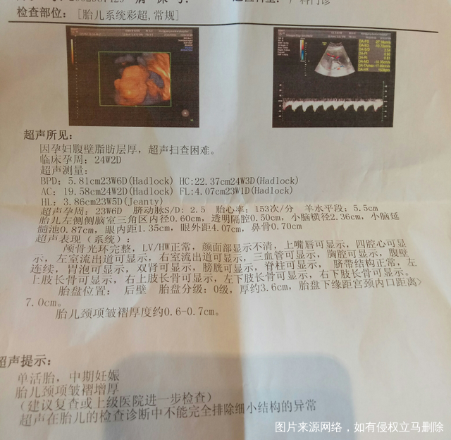 24周四维彩超显示胎儿颈项皱褶增厚0.6-0.7cm