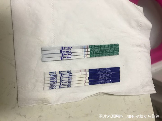 今天第13天了,打算下午去抽血,第一张是早早孕的照片,上面是海诺海氏的试纸,比较显色,第七天就有水印啦,下面大卫的试纸灵敏度差一些,但是比较准确,咋呼的几率比较小。第二张是大卫的,中间丢了几条,第二天有粉印,之后慢慢颜色变浅,最浅的时候有个水印,到第七天突然又开始变深了。那时候看到只是水印,内心觉得没戏啦。群里的姐妹也有第十二天才测出来的,所以各位姐妹要坚持,不要放弃。