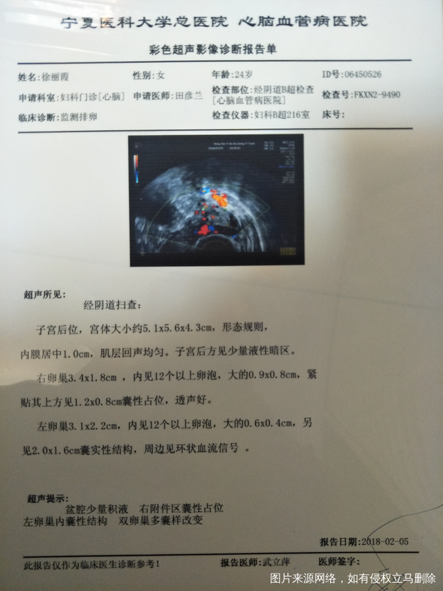 去医院确诊了多囊,然后大夫开了二甲双胍,复方胶囊,之后1月19日来月经,25号结束,打了七天的绒促,隔两天B超监测卵泡,涨的还算可以,最后一个礼拜周四监测到,左右两边,各有两个大卵泡2.1*1.8的泡泡,周五九点打了达菲林,然后大夫说周末同房。。。然后我周五,周六,周日,三天都安排同房,就怕错过,周一去检查是否排卵,结果是如下图,大夫说左侧确定已排卵,让回家等消息开奖,可是这都七天了,测不出来,感觉日子好漫长,