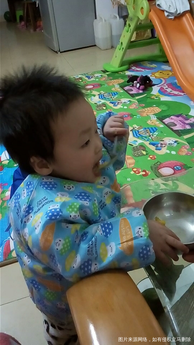 能自己拿着勺子吃饭了,虽然掉得满地都是。但是吃饭特别积极,不让别人帮忙,自己十多分钟就搞定一碗饭菜(小半碗喂了土地爷[偷笑])。