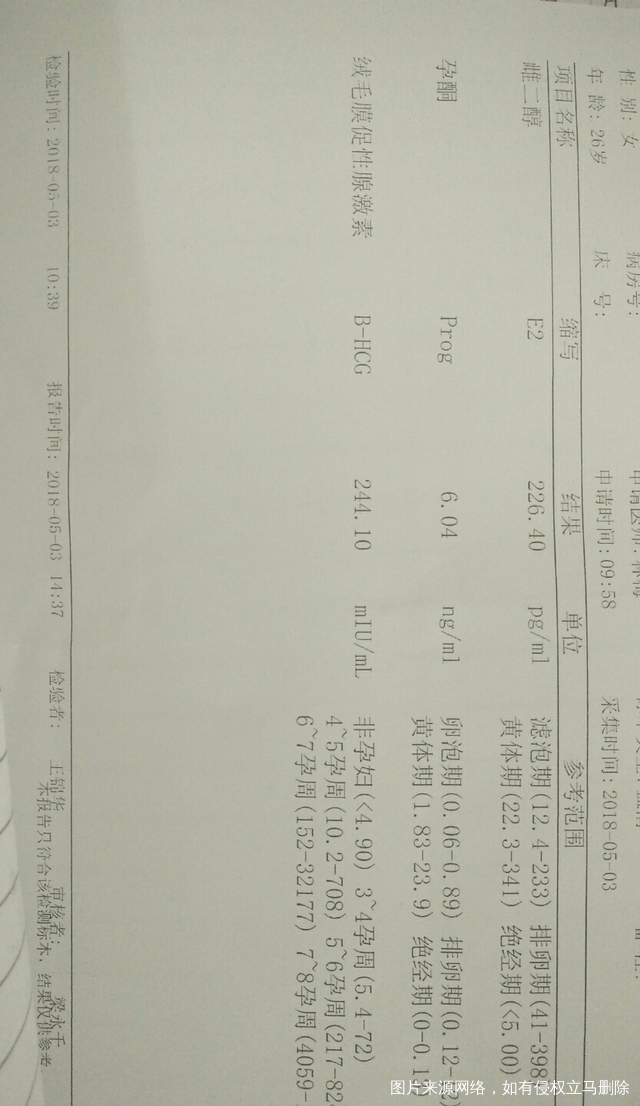 在三号早上六点就起来,还是有血,赶紧叫上老公去医院。去到医院也不知道干什么,今天特别多人,等号等到26号,一个早上也不敢吃早餐。等到十点多终于到我了,医生马上开了验血单给我。花费300多块钱,下午两点半拿到结果,血值244.10。孕酮6.04。雌二醇226.4。