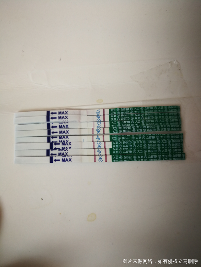 末次4.13,姨妈推迟六天了,还没有去医院,最下面那根是今天早上测的