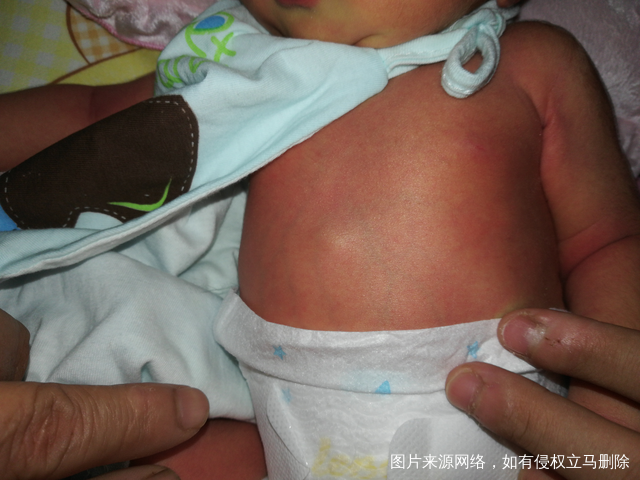 刚出生七天的宝宝。胸口有一个突出来的肉球。
