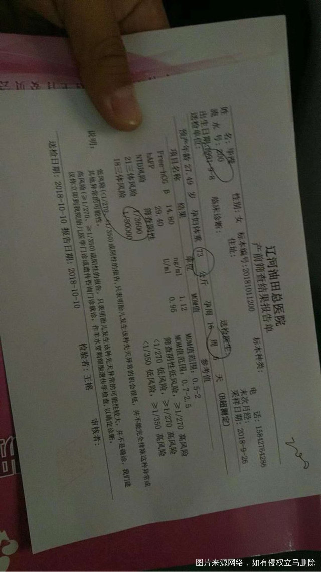 今天刚取的唐筛结果!医生说低风险,没事。宝宝真棒👍🏻来接好运吧,宝宝们一起...