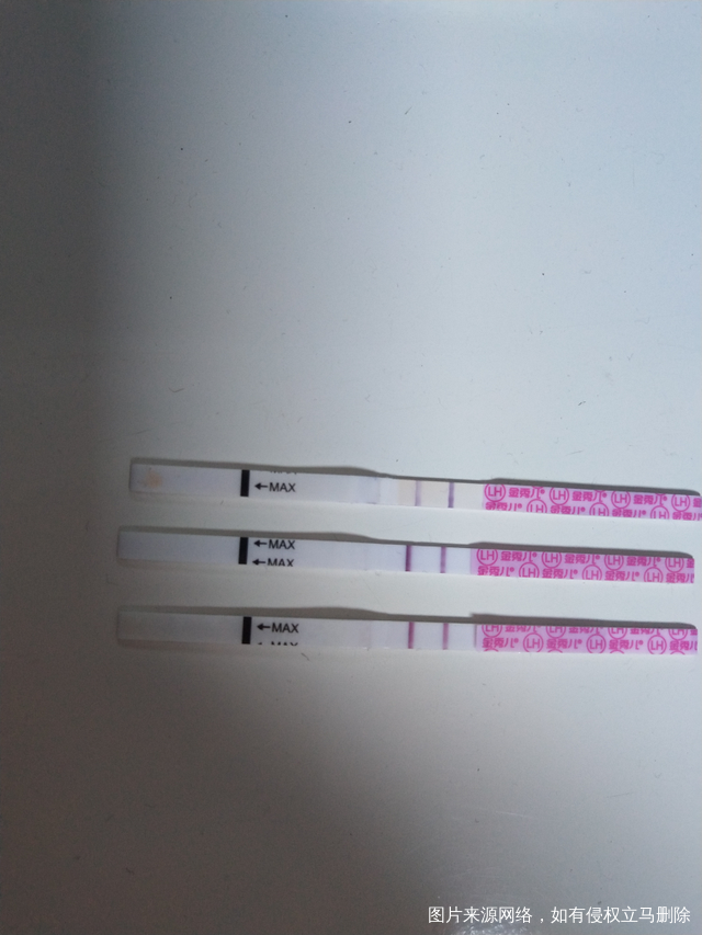 今天早上在医院测卵泡1.75了,医生让我晚上用试纸测一下,颜色深的话今晚安排,明天早上再去医院测卵泡,晚上试了两次试纸,这三个试纸最上面是昨天的,中间是今晚七点半的,最后是刚刚九点半的,我觉得检测区比对照区红的发紫啦!明晚再安排会不会就错过了呢?