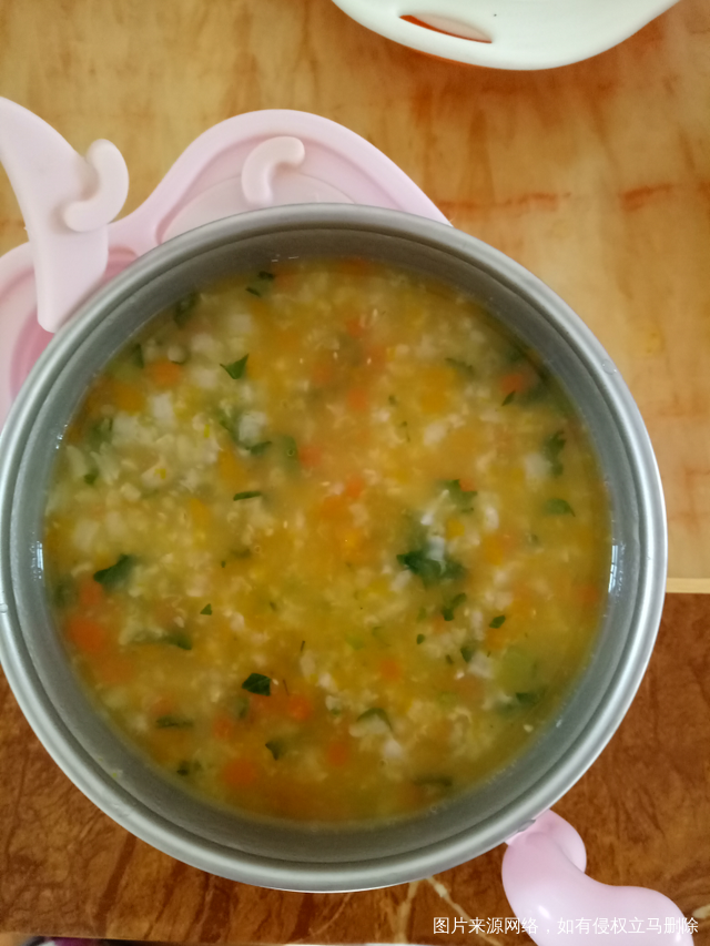 今天煮的粥(胡萝卜,南瓜,菠菜),时间太赶,没有加荤,粥也没煮稠,水有点多,值得高兴的是宝宝基本吃完了。
