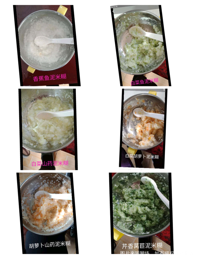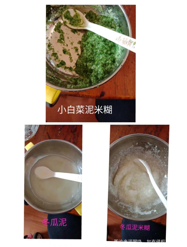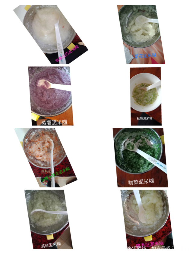 这时候已经到了六个月了,我开始给他添加菜泥,从当季的青菜入手,一种青菜连吃三天,确定无过敏反应再换另一种蔬菜再吃三天,如此继续,也从最开始的稀米糊,渐渐变稠。七个月的时候按说可以吃肉了,由于肉食制作不太容易,又比较腥,我怕做不好他不吃,只给他吃了两次鱼,其他肉没有给他吃,又把以前吃过的菜和新的菜掺起来喂,快八个月了,给他吃了蛋黄,按说鸡蛋属于易敏食物,蛋黄最好八个月开始少量添加,蛋清则一岁以后添加,可最后喂来喂去,每天吃菜泥米糊怕他也吃腻了,就给他吃了蛋黄,第一二天吃了半个,第三天吃了一个,没有过敏反应,又给他尝试了蛋清,也没有过敏,就整颗蛋给他吃了。阴历八个月了,看他吞咽和咀嚼能力都有了很大进步,开始给他尝试颗粒状的食物,如馒头碎,烂米粥,烂面条,碎疙瘩汤等,这几天吃的还不错。虽然做的饭卖相不太好,大人看起来没什么食欲,但他吃的还好,而且他小,不懂什么卖相不卖相的,只要营养全面就好了。哦,对了,水果我只给他吃过苹果和香蕉,有几次掺的米粉吃的,后来听说这样不太符合中国人的饮食结构,就单独给他吃了。有时候他吃进去以后偶尔会有干呕状态,其实只是他还不太适应,毕竟从最初的母乳过度到半固体和固体状食物,总要有个适应的过程,宝妈们不用担心,这是宝宝在适应,在进步。