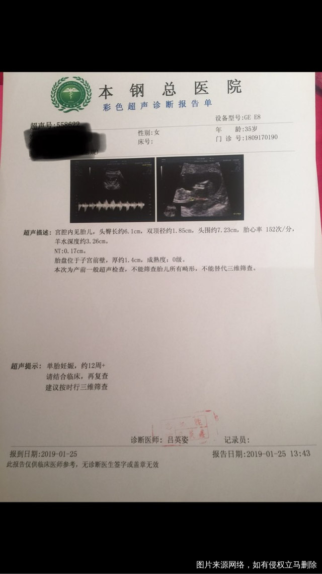 2019年1月25日做的NT很顺利,检查之前喝了冰糖雪梨甜的这样胎儿不会睡觉,医生说胎儿很活跃像青蛙一样乱跳,还让我听了胎儿的心跳,真的好高兴。