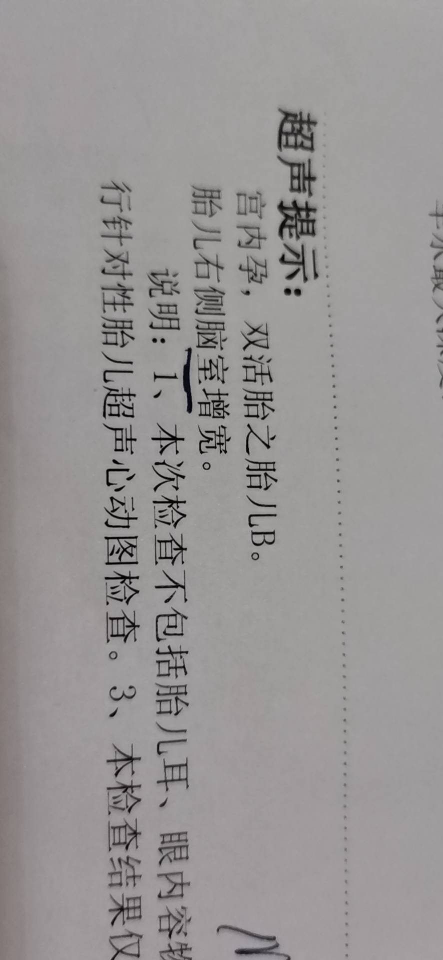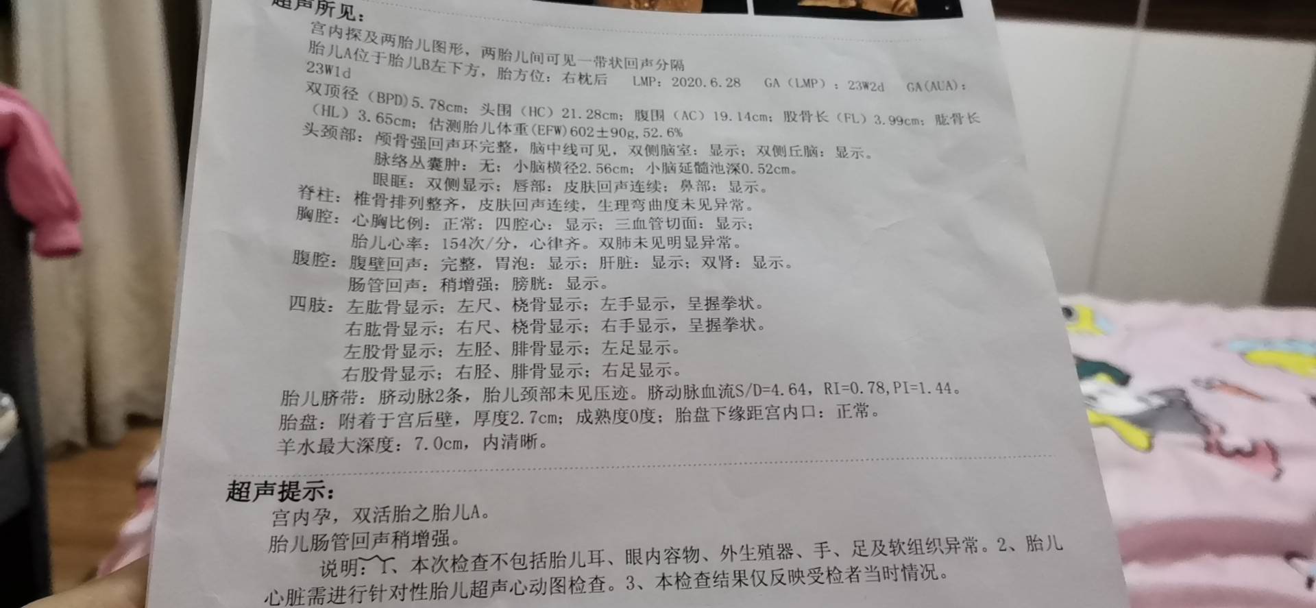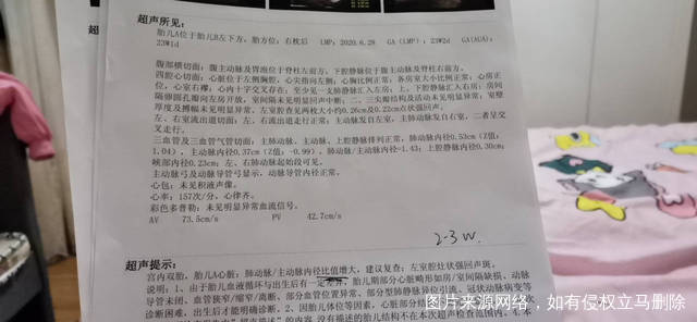 四维彩超显示双胞胎胎儿A肠管回声稍增强。肺动脉/主动脉/主动脉内径比值增大。左室腔灶状强回声斑。胎儿B,右脑室增宽约1.21CM,左脑室宽约0.94。左室灶状强回声斑,约0.3CM点状强回声。