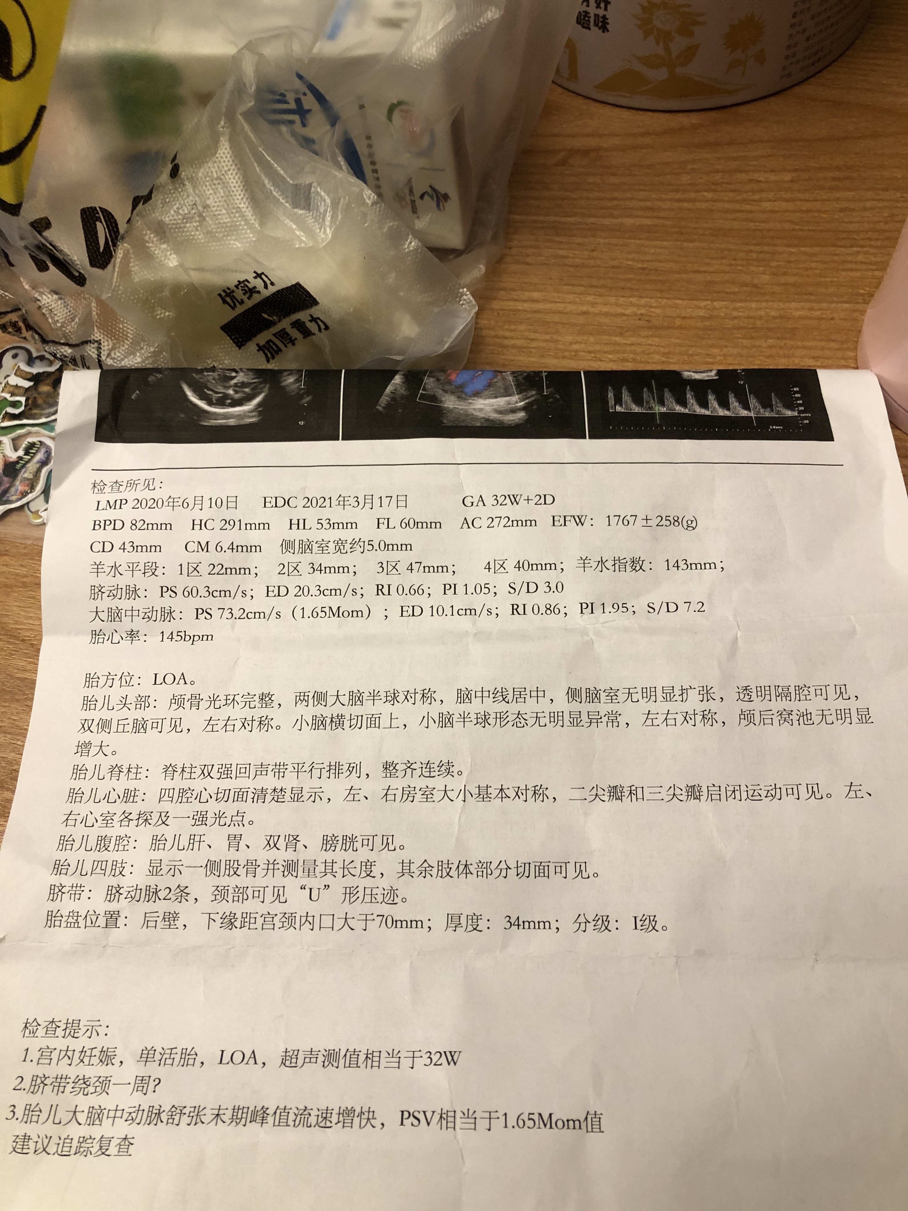 怀孕32周超检查胎儿中动脉流速增快psv相当