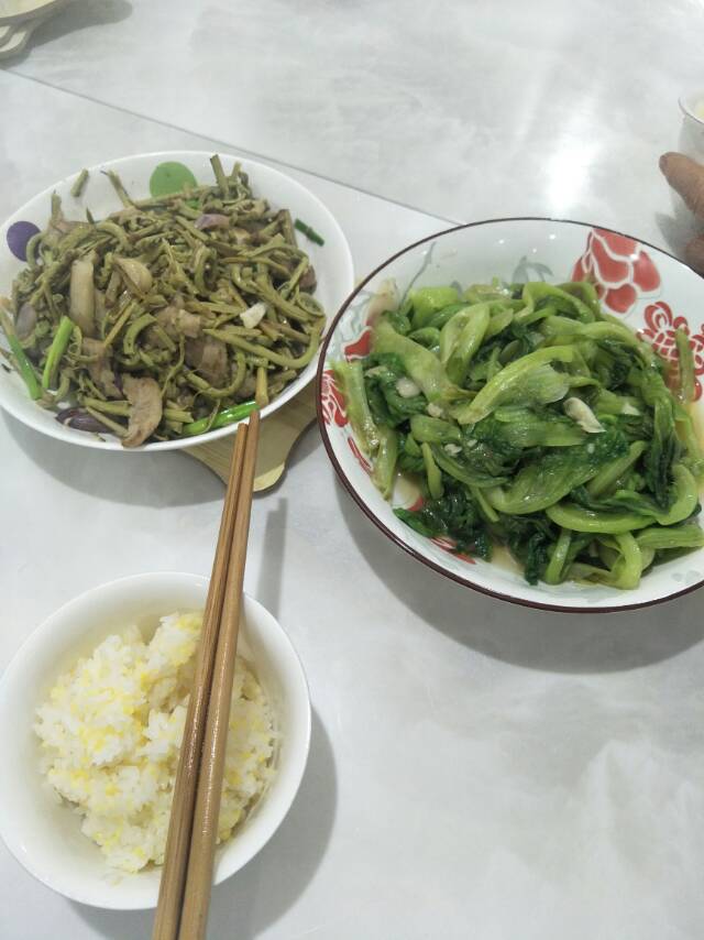 早餐,蛋肉肠粉。午餐,菜心,清蒸鸡肉 晚餐,