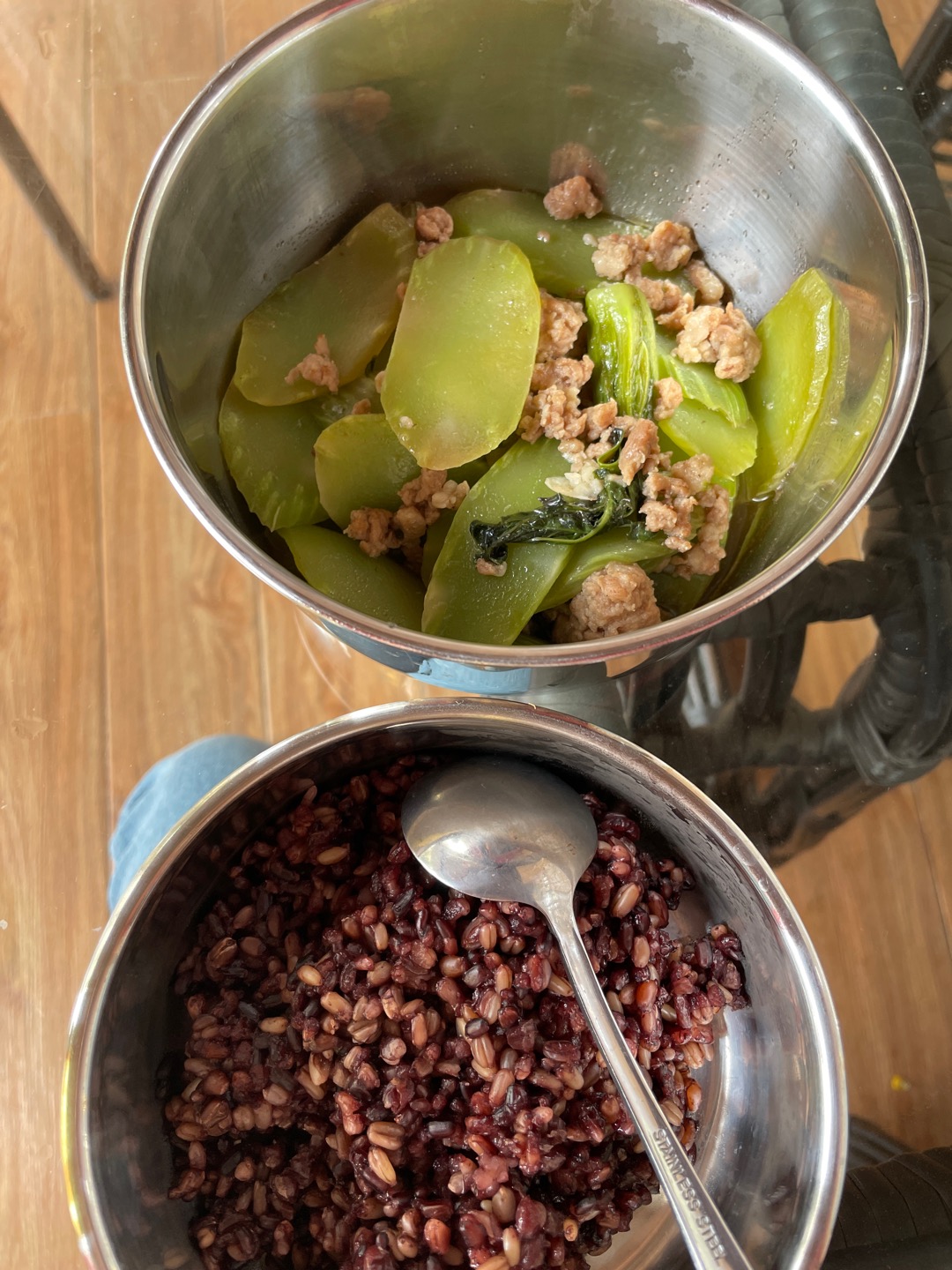 午饭:一碗粗粮饭+碎肉炒莴笋,