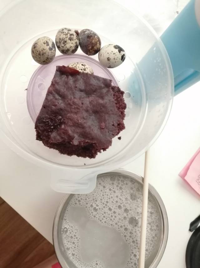 早餐,鹌鹑蛋。紫米面发糕,黑豆蛋白粉