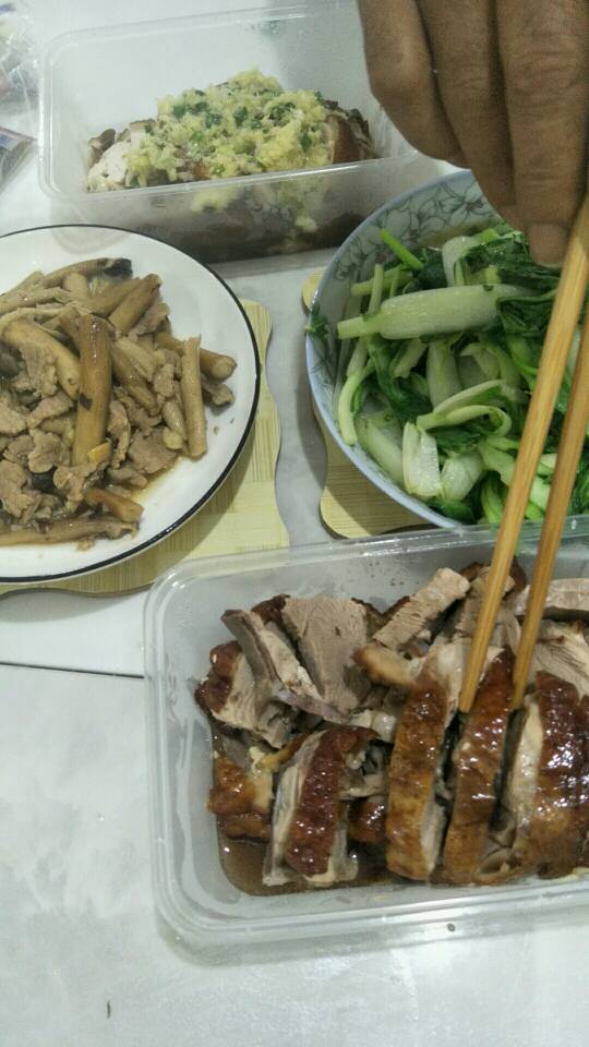 晚餐:烧鸭,酱油鸡,菜心,茶树菇炒猪肉
