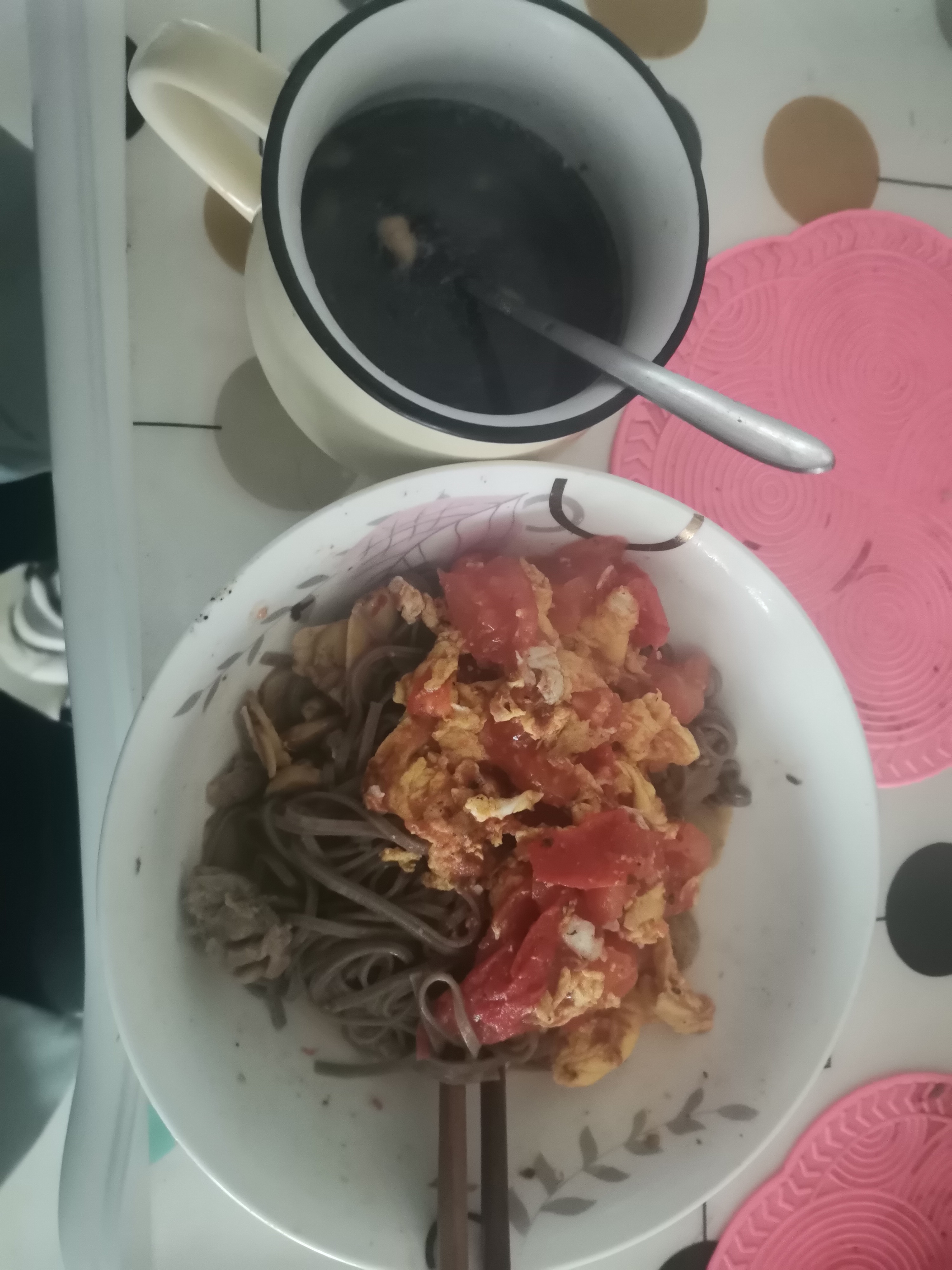 西红柿鸡蛋+鸡肉荞麦面,黑豆坚果粉。