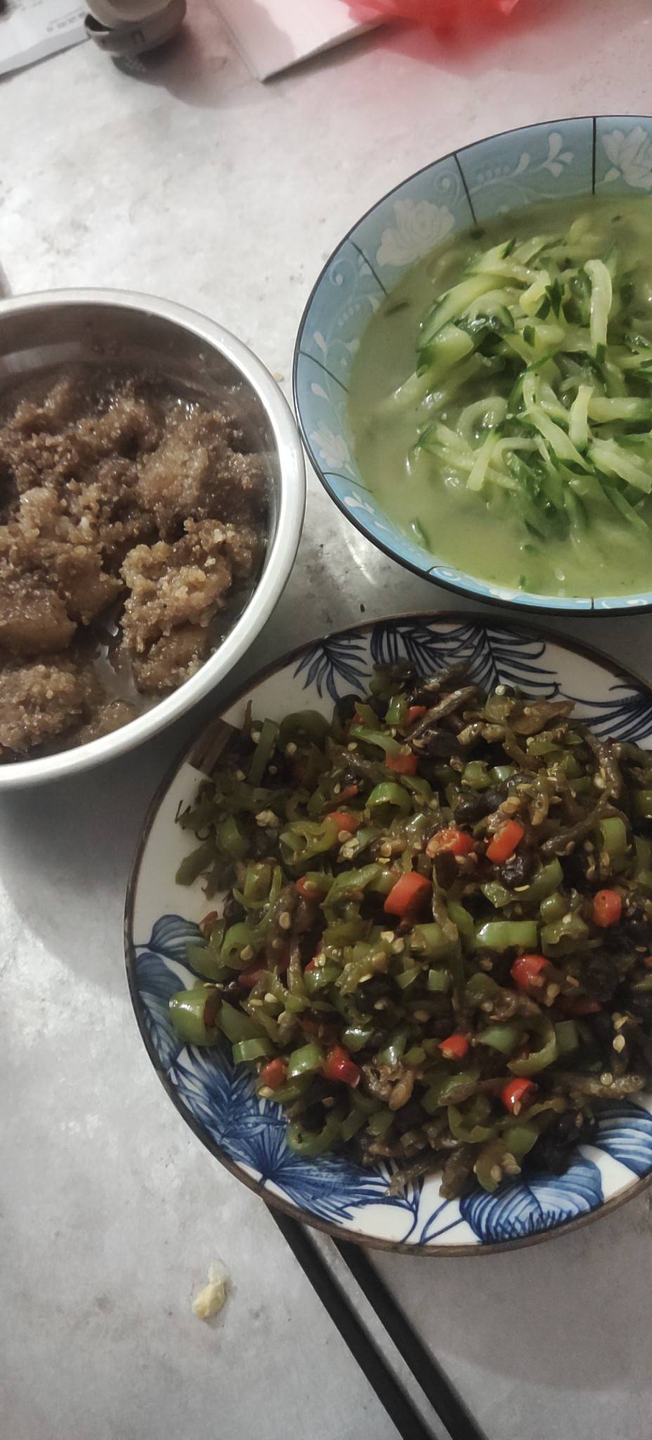 粉蒸肉+青椒炒鱼仔+黄瓜丝,黄瓜我吃的,其他