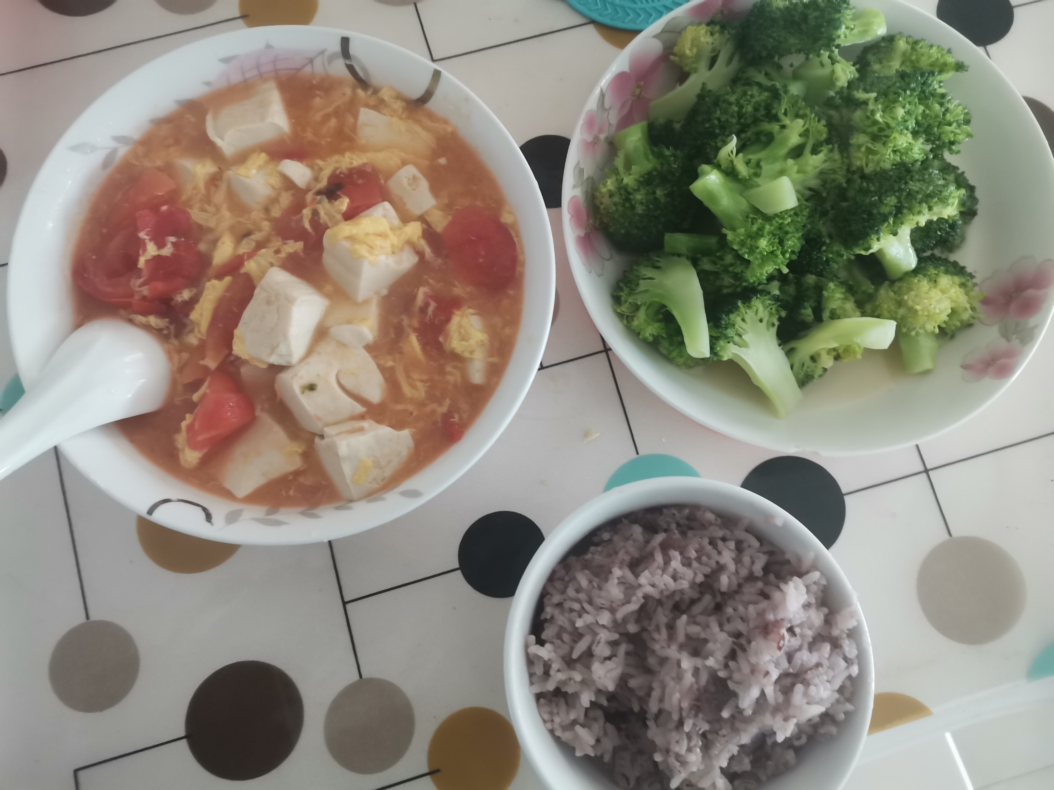 西红柿鸡蛋豆腐汤,清炒西兰花。