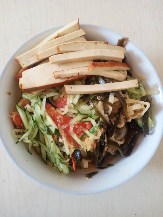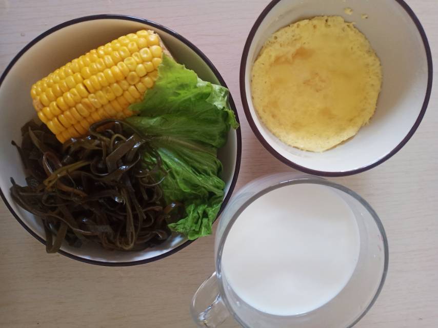 早饭海带生菜玉米,鸡蛋羹牛奶,中午西红柿打卤