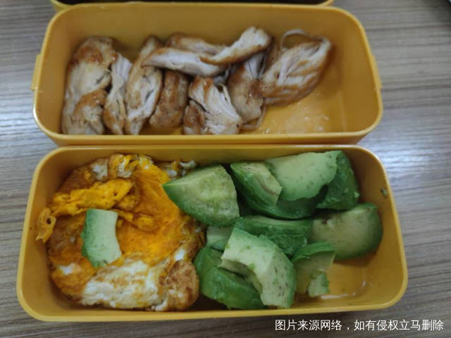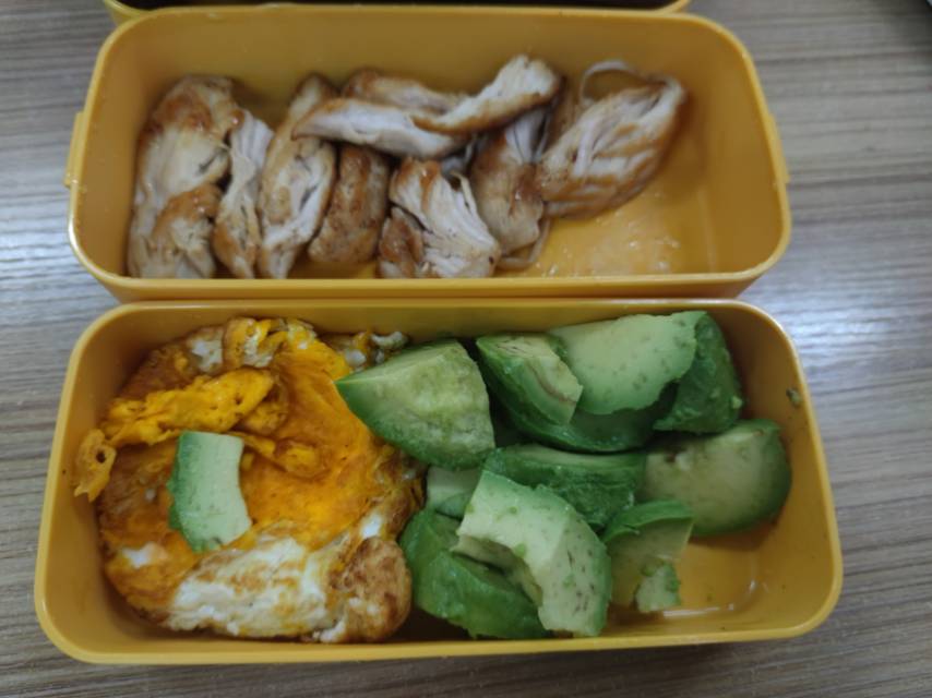 早餐:煎鸡蛋一个+牛油果一个+煎鸡胸肉~