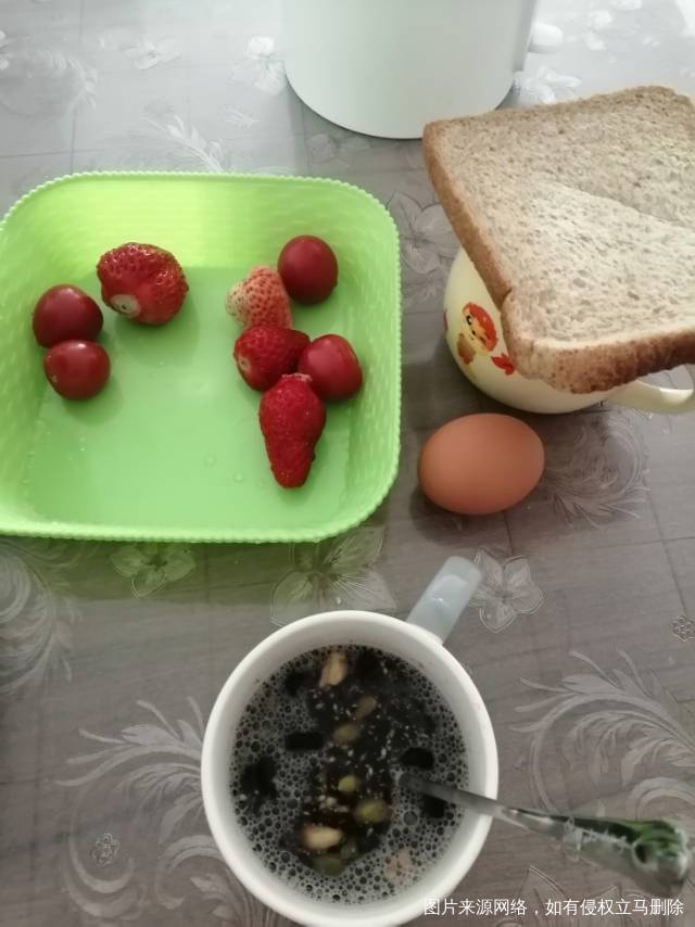 #第1天# 早餐,一片全麦面包切片,一个鸡蛋,一杯黑豆坚果粉,上午加餐水果,草莓和小番茄