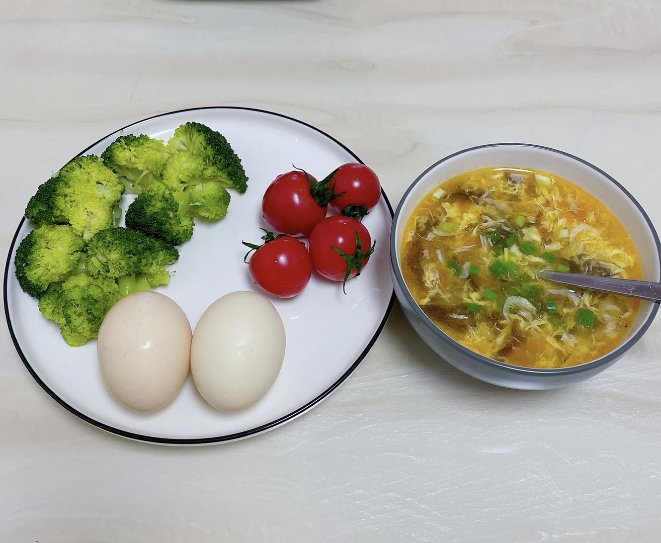 #第5天# 早餐打卡:水煮西蓝花,小西红柿,两个鸡蛋,一碗汤
