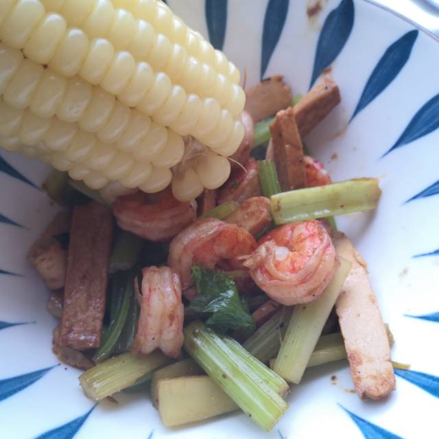 今日午餐:炒芹菜豆干虾仁,外加半碗杂粮粥