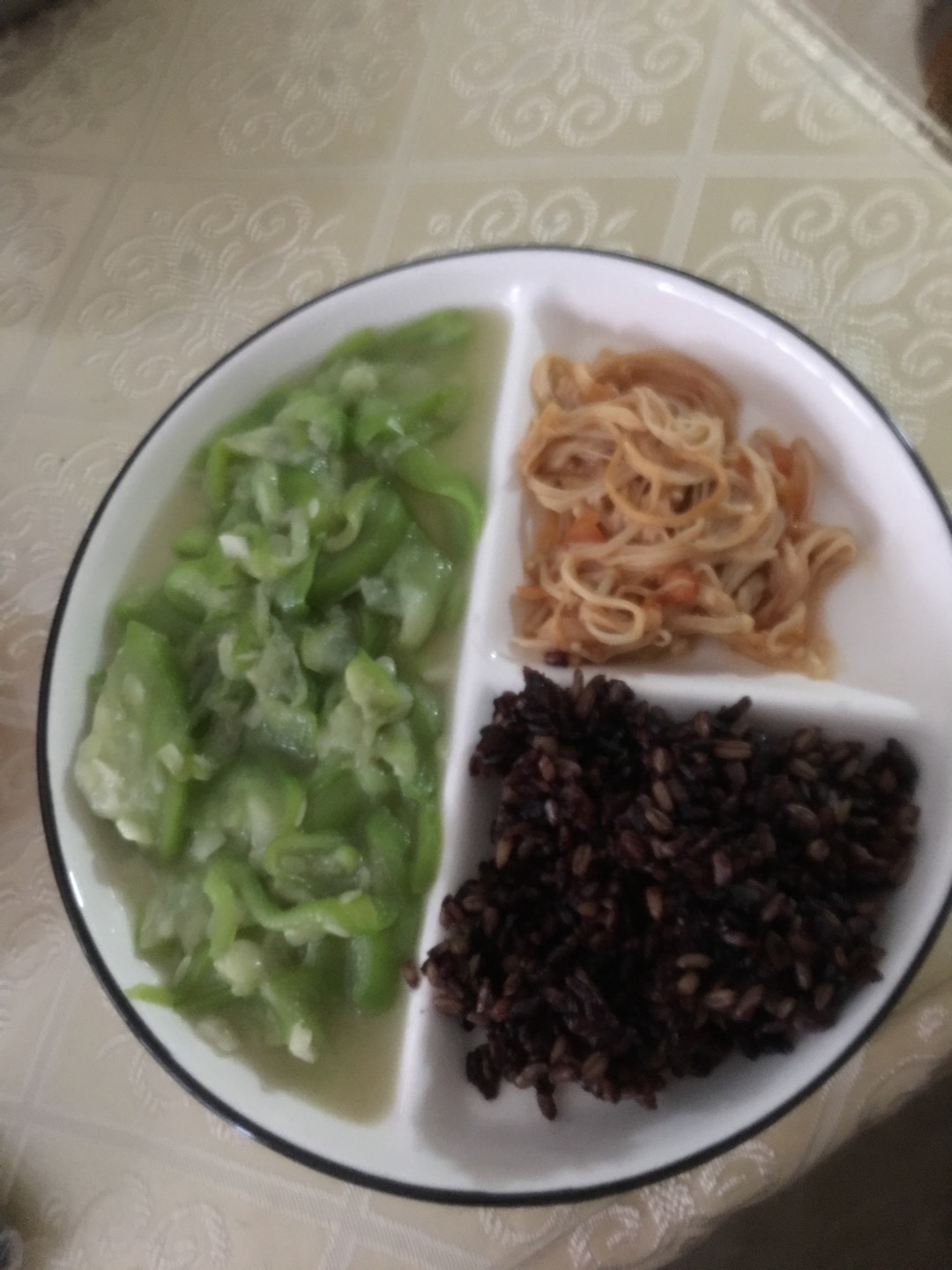 黑米糙米饭金针菇西红柿丝瓜~水果是桑葚~