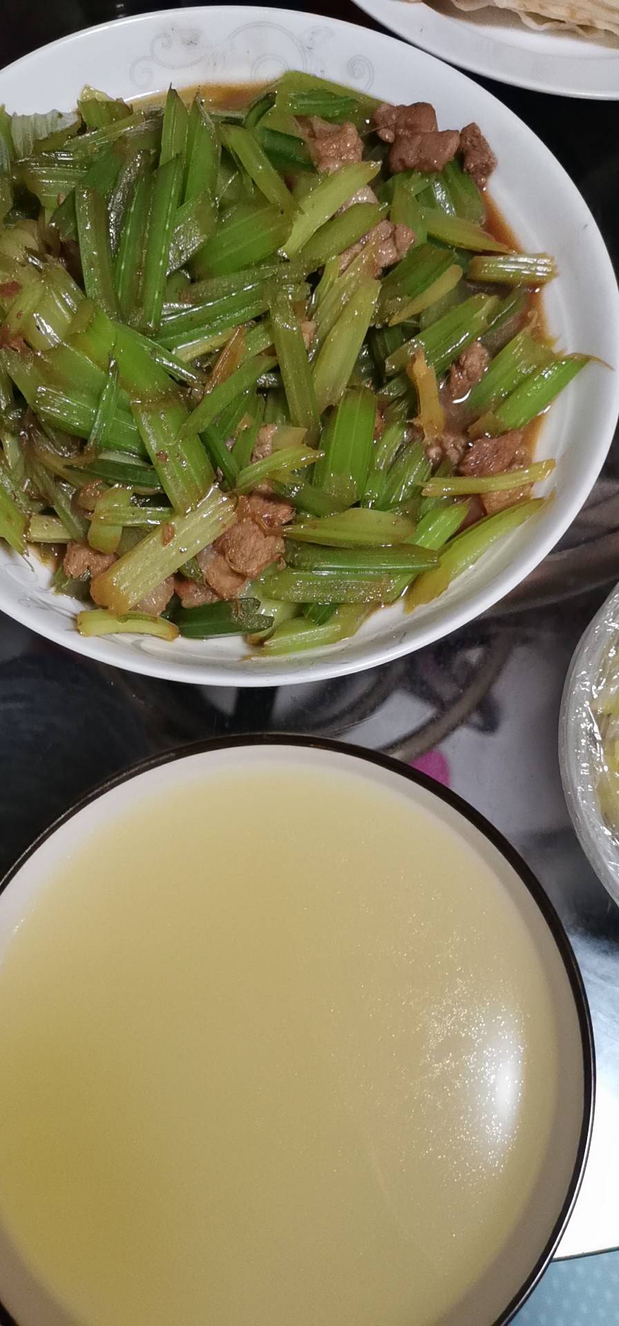 今晚的晚餐芹菜炒肉和一碗小米粥