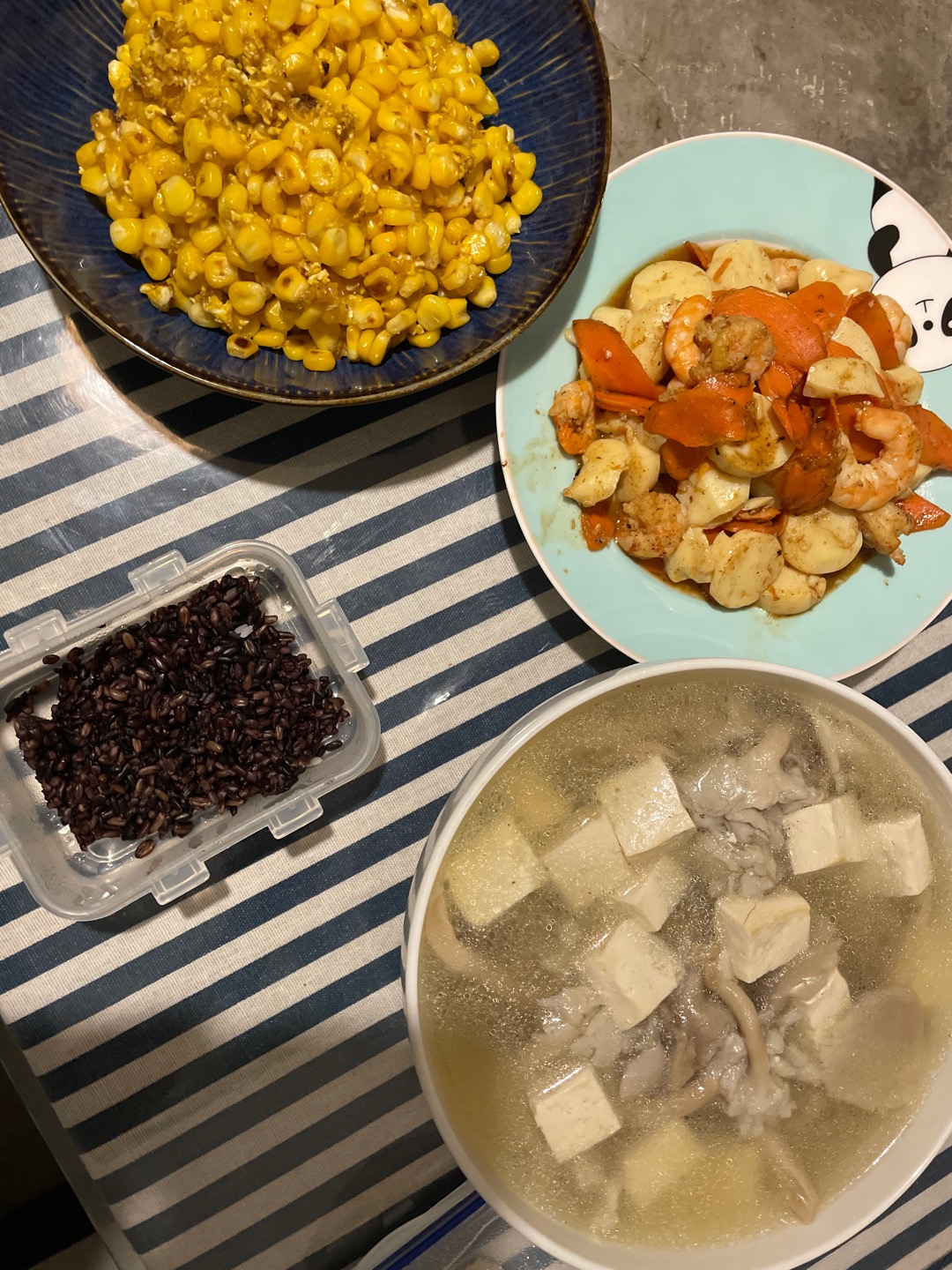 晚饭:小半碗粗粮饭+炒玉米+日本豆腐炒虾仁+