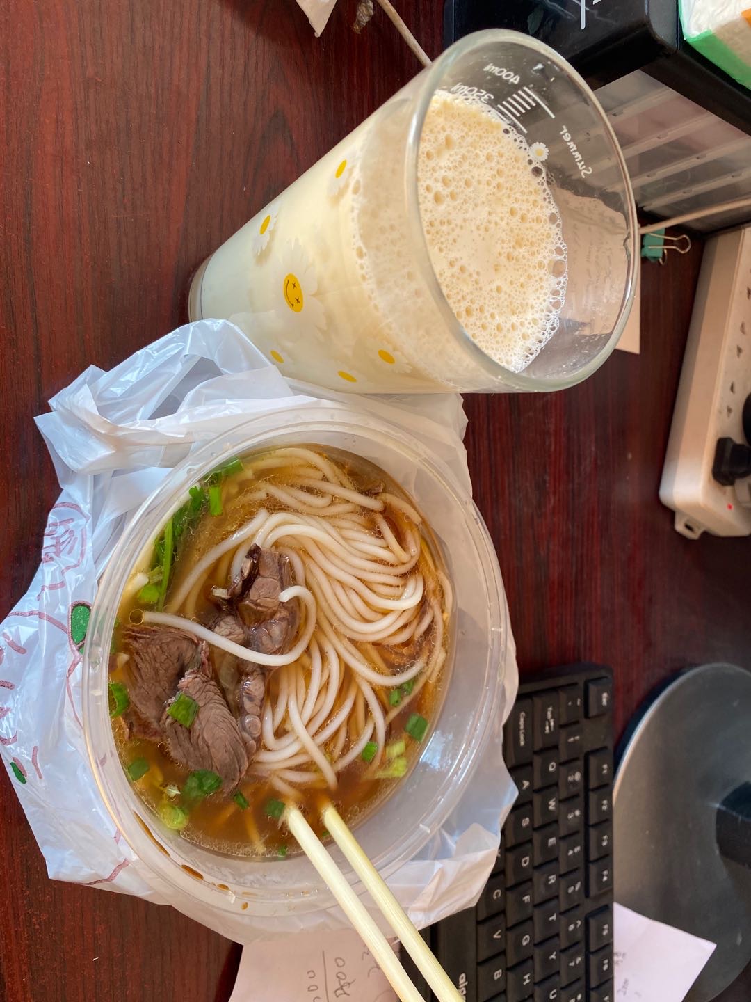 早餐打卡一碗牛肉米线和一杯黄豆浆🥱