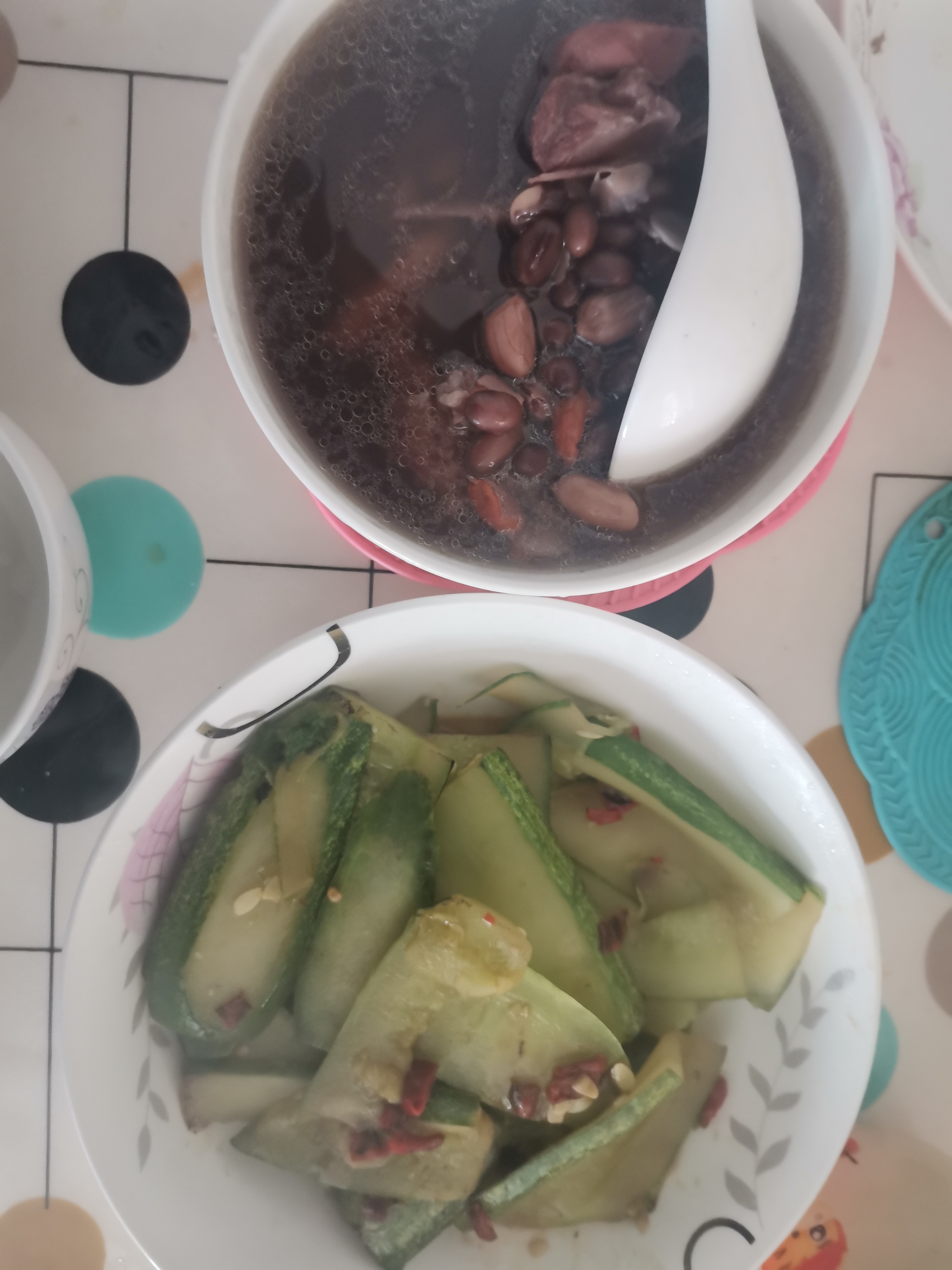 西洋参黑豆花生排骨汤,炒黄瓜。