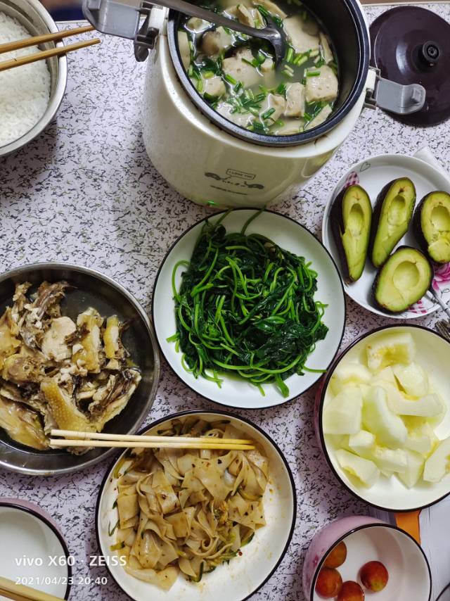 晚餐鸡肉番薯叶凉皮牛油果李子吃一点点香瓜肉饼