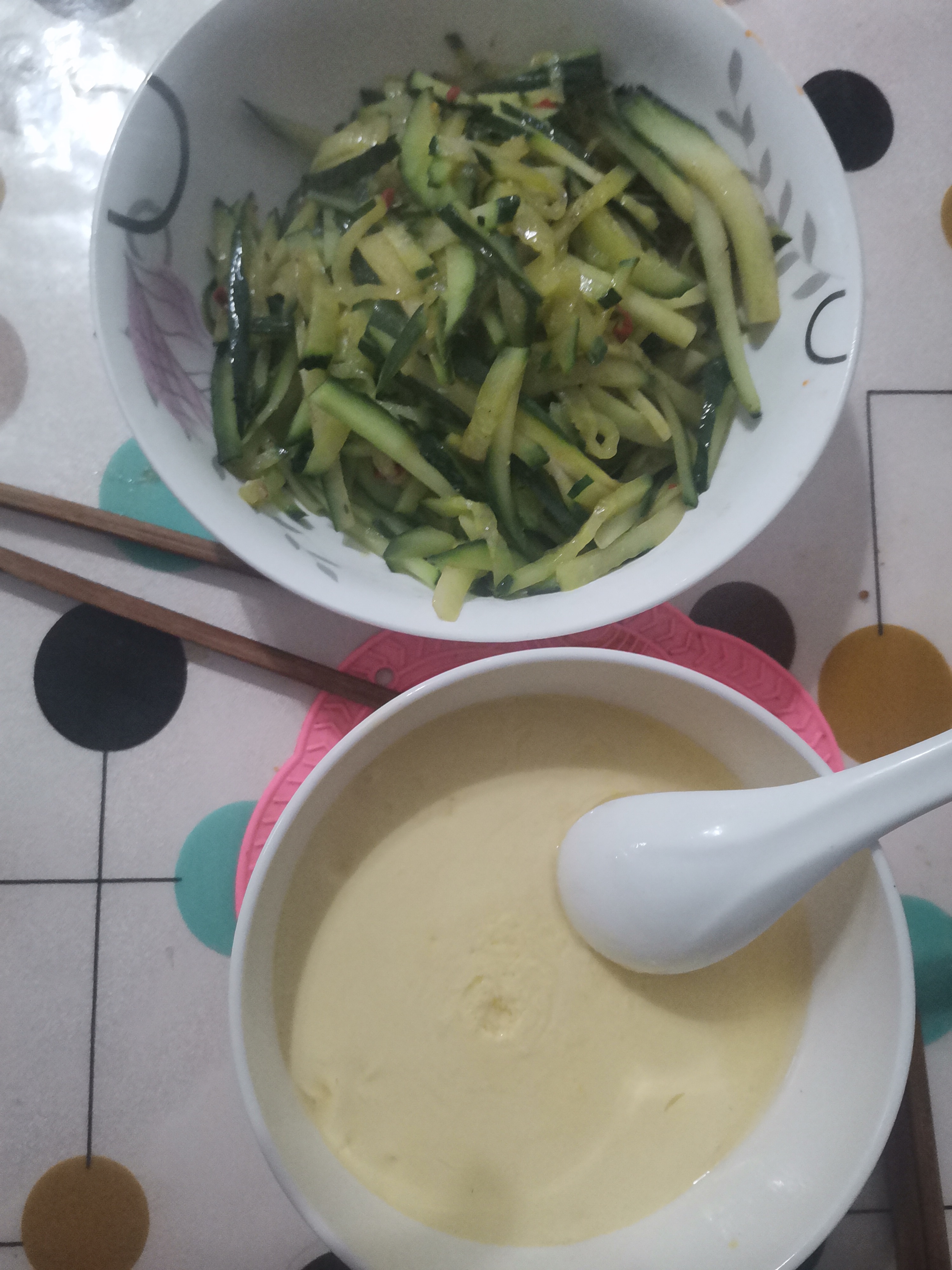 蒸鹅蛋,清炒黄瓜丝,一碗黑米饭,忍不住吃了几