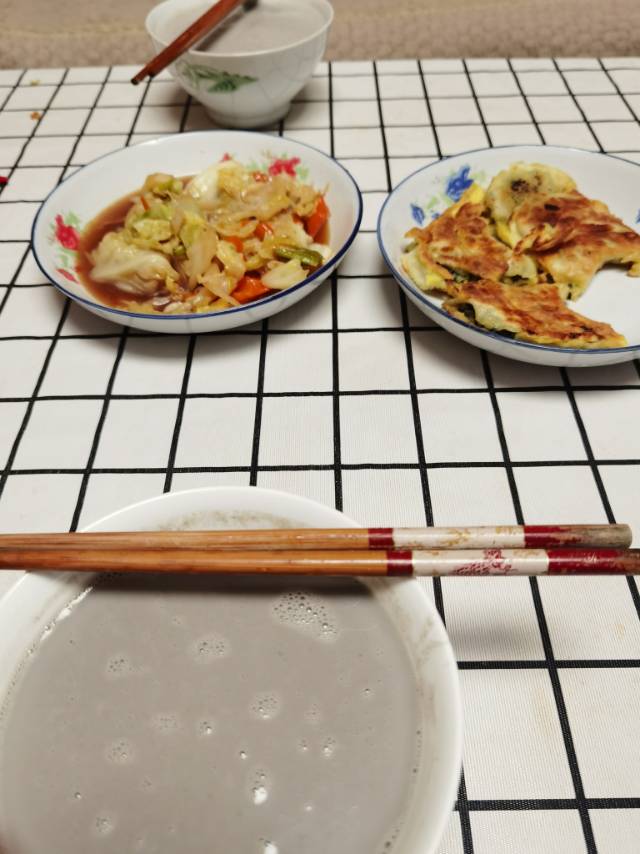 早餐黑豆浆炒圆白菜鸡蛋煎饺