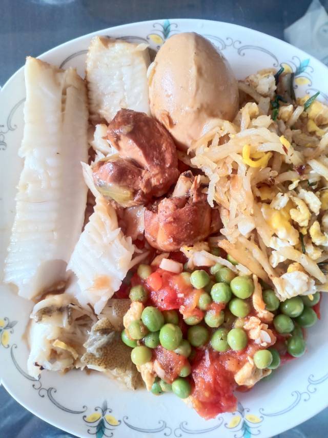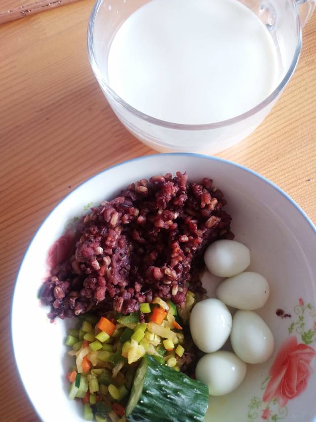 早饭,牛奶杂粮饭,鹌鹑蛋蔬菜 中午,蒸鱼鸡肉