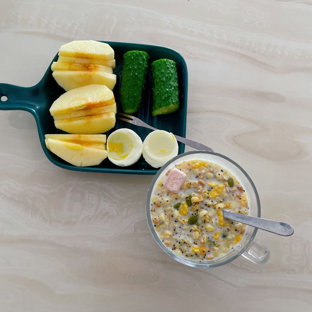早餐打卡:苹果,黄瓜,鸡蛋,低脂牛奶麦片