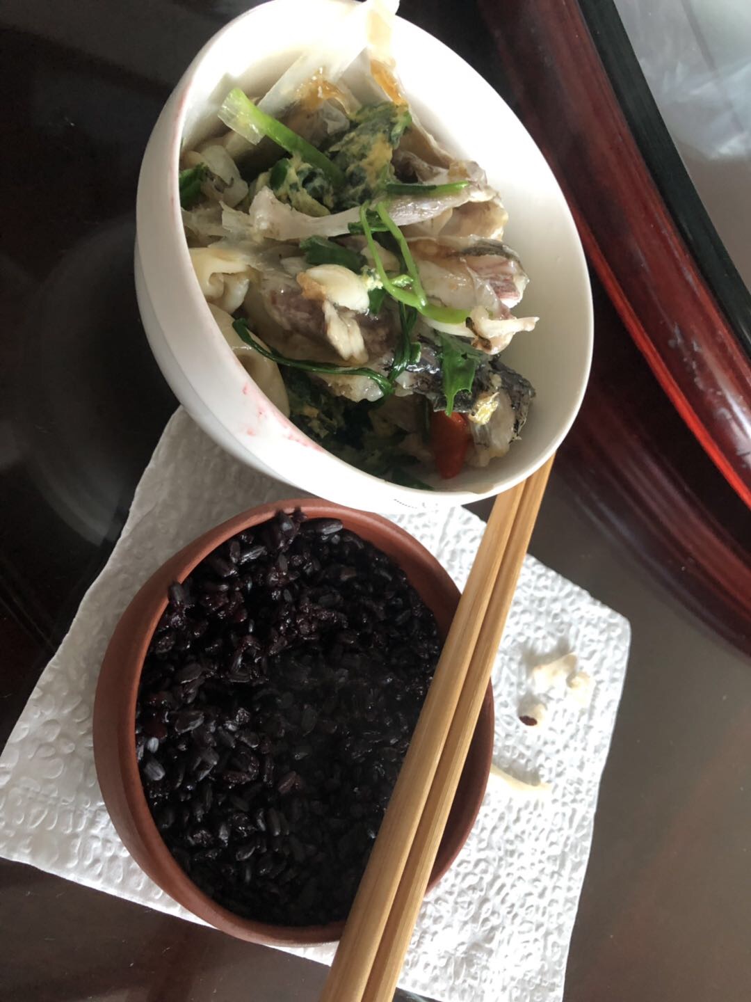 黑米饭➕鱼头➕空心菜➕韭菜炒鸡蛋