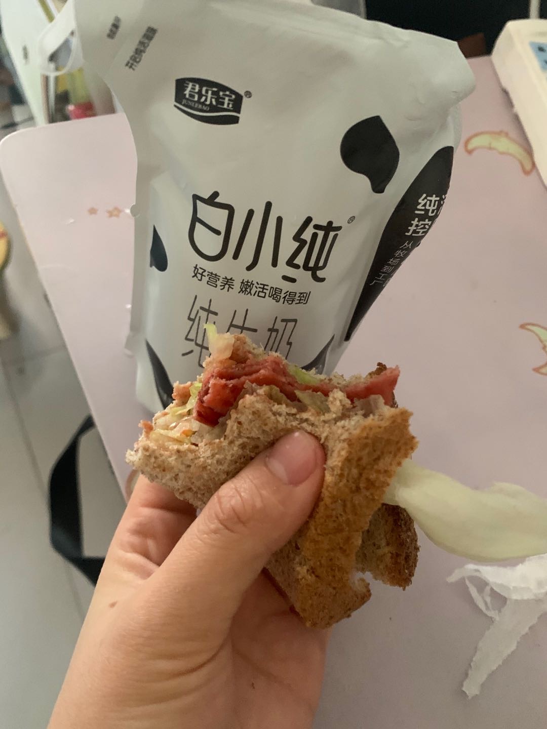 早餐 无蔗糖牛奶 全麦面包加一根培根
