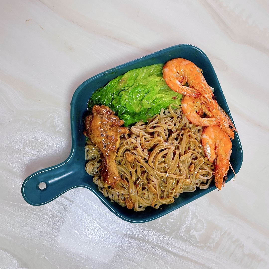 午餐打卡:荞麦面,虾,生菜,鸡翅根