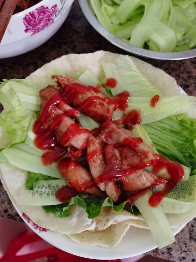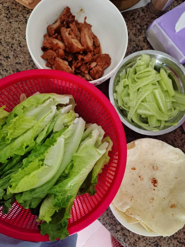 中午:鸡扒➕ 青瓜➕ 生菜卷饼吃