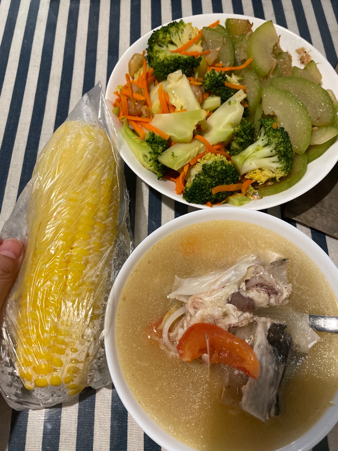 晚餐:一个玉米+一碗鱼头豆腐汤+剩菜