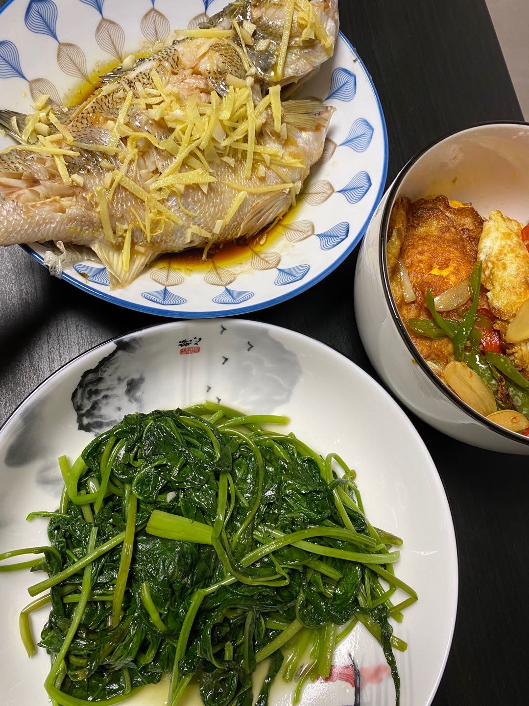 晚餐 清蒸鲈鱼 蔬菜 荷包蛋